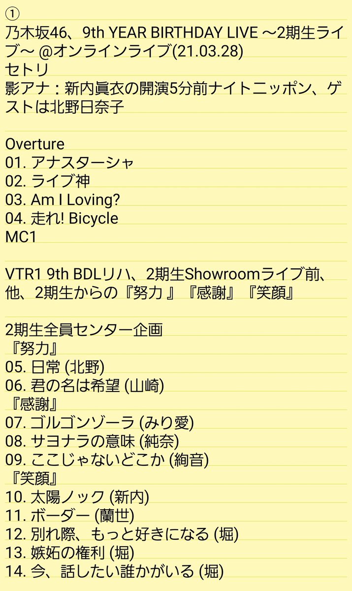 乃木坂 ライブ セトリ 東京ドーム- 乃木坂46 バスラ 9th ライブ 21/2/23 セトリ アイドルグループ乃木坂46が9周年となる節目で21年2月22日23日と2日間に渡りオンラインライブ 「9th year birthday live コンサート」 が開催されました。 9周年バースデーライブ(バスラ)の前夜祭(2・22)も非常に盛り上がっていたよう 人気アイドルグループ・乃木坂46のデビュー5周年を祝う「5th year birthday live」が、2月日~22日の3日間さいたまスーパーアリーナ(通称ssa)で開催されました。 3日間の総動員数11万人、ライブ総時間12時間。卒業やサプライズ、3期生の登場など今までとは少し違ったバースデーライブになりました。